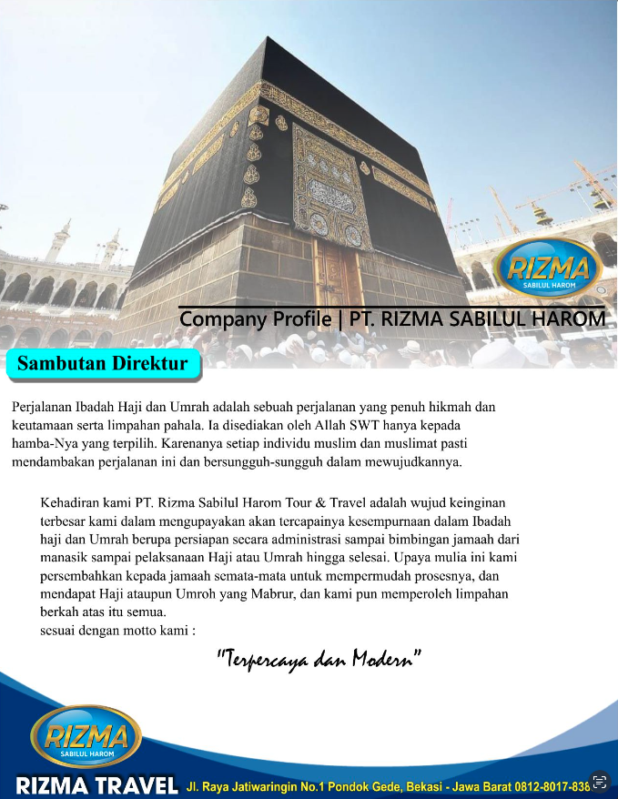 Memberikan Pelayanan Haji & Umrah Yang Terbaik Untuk Para Jamaah. Rizma Tour telah berpengalaman dalam memberangkatkan jamaah ibadah haji dan umrah. Kami sangat menjaga kepuasan dan kepercayaan jamaah dalam melaksanakan ibadah haji dan umrah. Rizma Tour telah memiliki izin Resmi dari Kementrian Agama RI untuk penyelenggara Umrah di Indonesia.