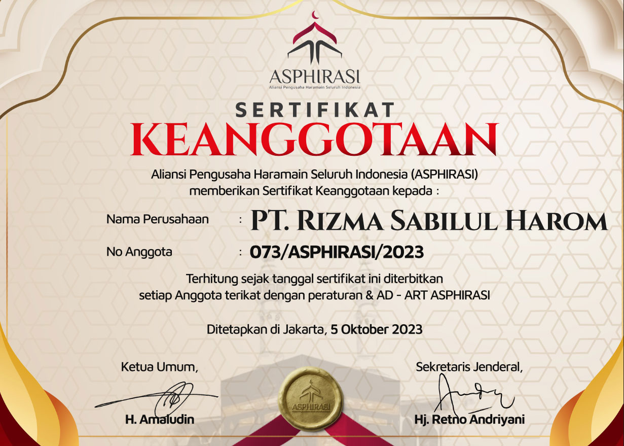 Sertifikat yang diberikan kepada anggota suatu organisasi Aliansi pengusaha Haramain Seluruh Indonesia (ASPHIRASI) pada tanggal 5 Oktober 2023