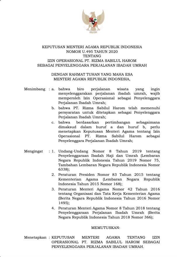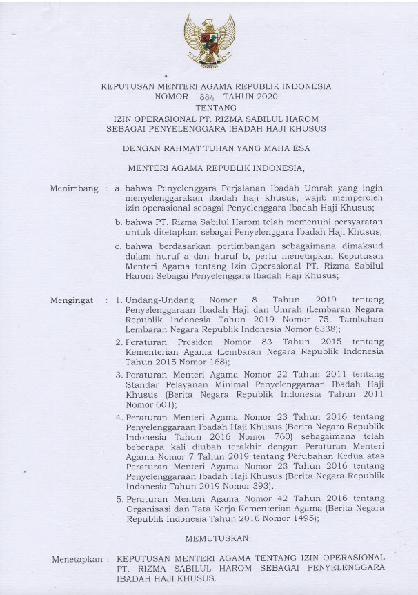 Surat Keputusan Mentri Agama tentang izin oprasional PT. Rizma Sabilul Harom sebagai penyelenggara perjalanan ibadah umrah.